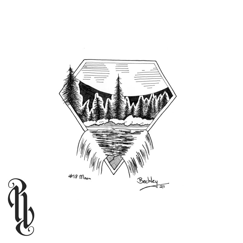 Nighttime in the woods next to a river with a giant moon in the background. Some might say a super moon. This drawing combines several drawing motifs and styles I’m known for including trees, the line work in the rocks, and moons. Part of my 2021 Inktober series.